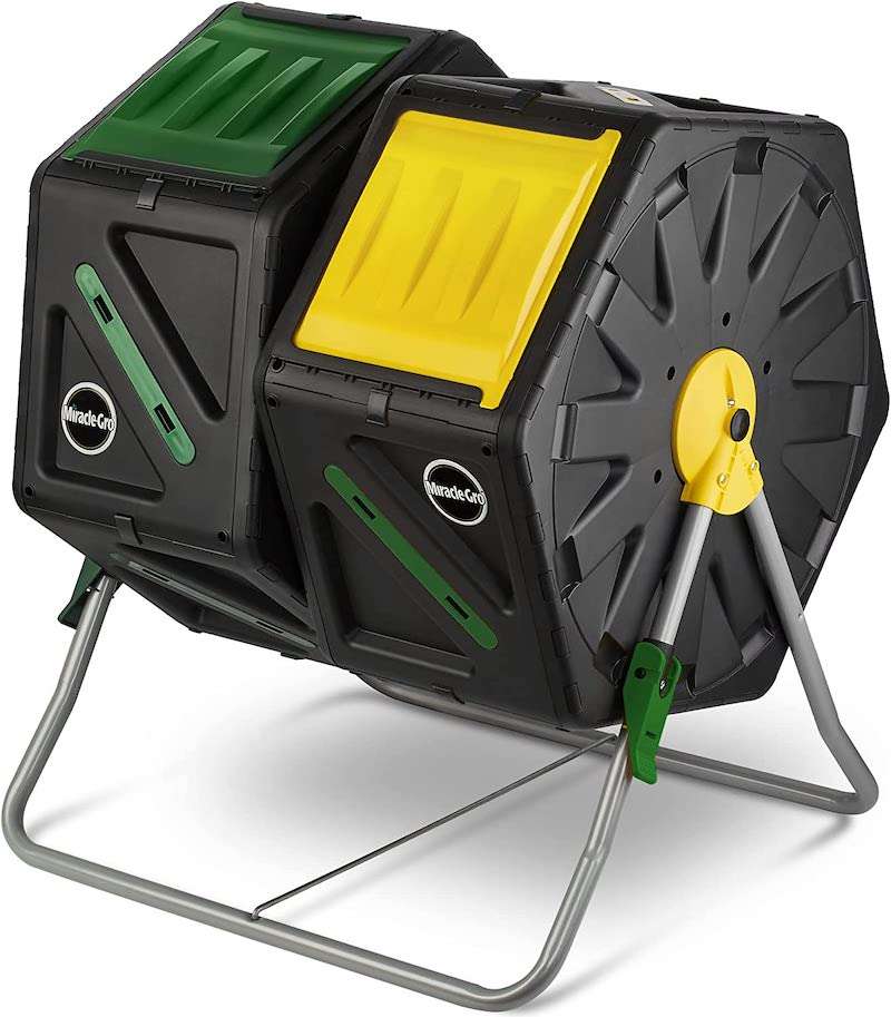 | I love this compost tumbler because it has two seperate compost bins. That way you can leave one side to finish while actively adding to the other. This is a smaller model, which would be perfect for those composting food scraps or have a small garden. |