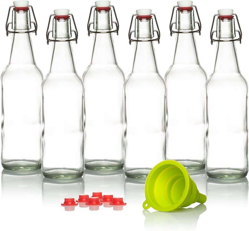 | Perfect for kombucha, beer, kiefer, soda, or any other homebrew! Includes collapsible silicone funnel and replacement high-pressure gaskets. The glass is rated for 58 psi (twice as much as required by heavily carbonated beer.) These bottles are specifically made for carbonated drinks. |